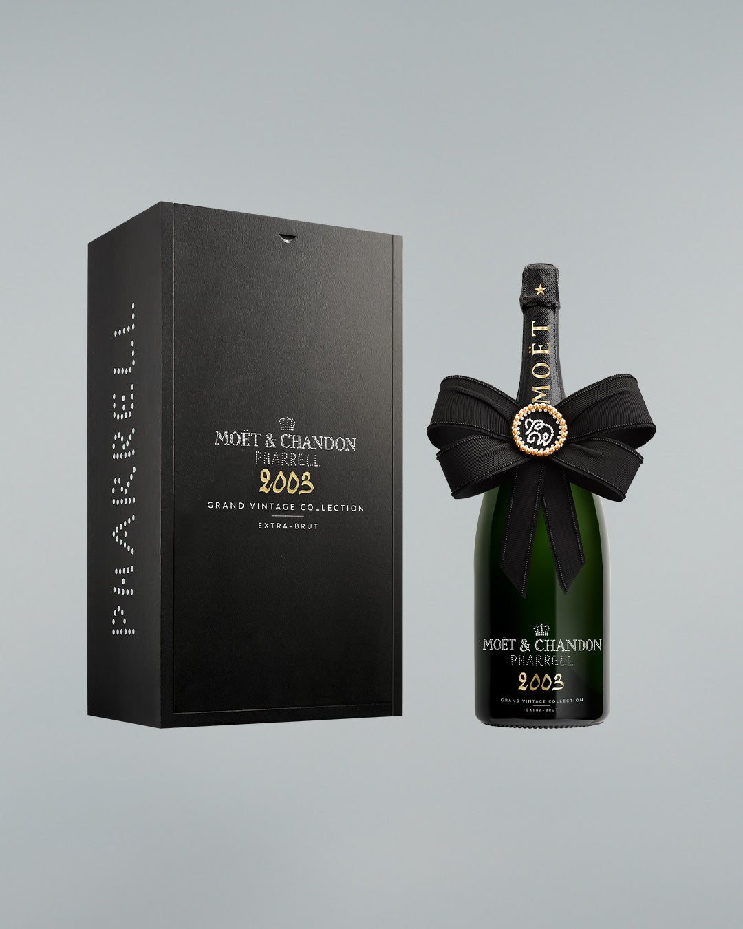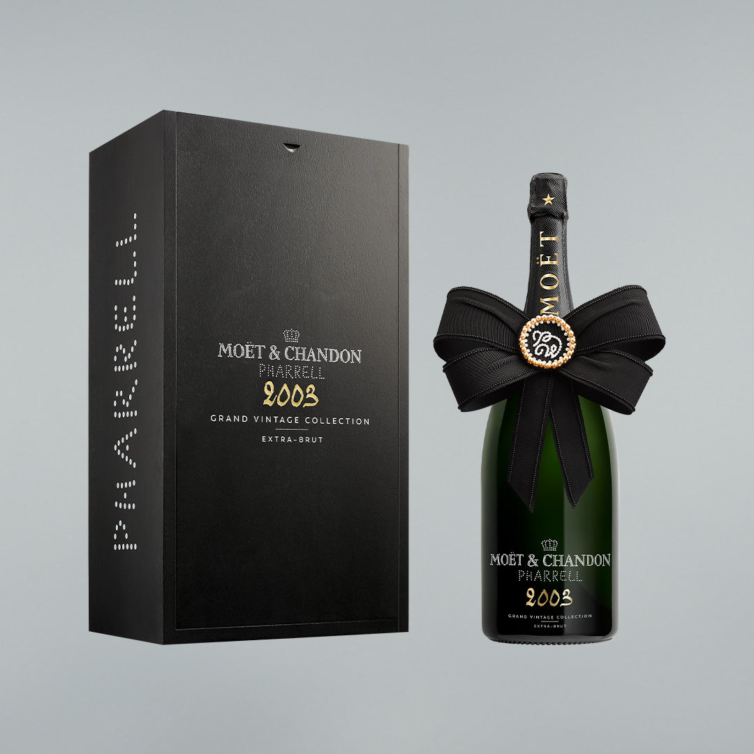 The Bow Creation is a reinterpretation by Pharrell Williams of Moët & Chandon's iconic tie. Transformed into an oversized fabric bow adorned with signature pearls, it has been created to dress the bottle for celebration. This embroidered bow is detachable to be worn as a brooch, adding a unique touch of elegance to an outfit. The year 2003 is a tribute to Pharrell's 30th birthday.