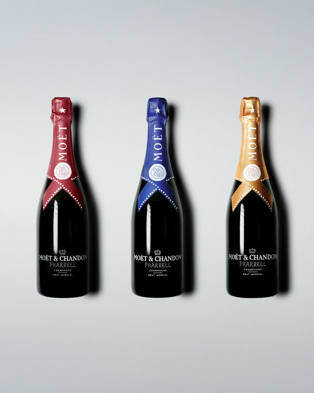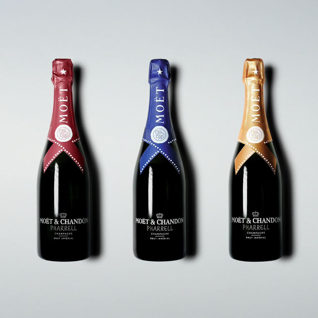 To elevate the birthday celebration, Moët & Chandon and Pharrell Williams unveil a limited-edition Brut Impérial trio collection dressed in Midnight Blue, Gold and Deep Red. Pharrell's signature is elegantly featured in white dotted pearls on the bottle, turning each piece into a true collector's item.