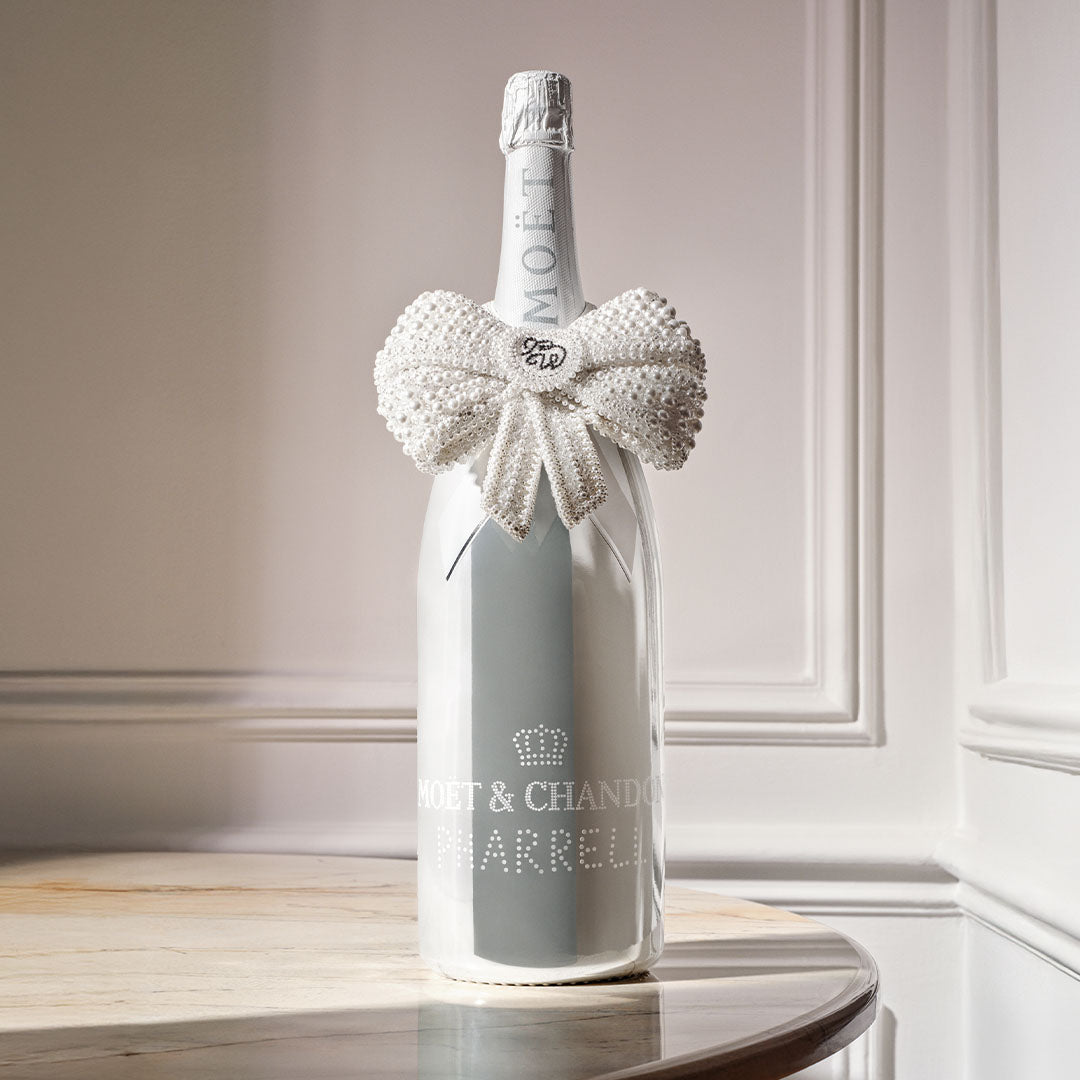 The Bow Creation is a reinterpretation by Pharrell Williams of Moët & Chandon's iconic tie. Transformed into an oversized fabric bow adorned with signature pearls, it has been created to dress the bottle for celebration. This embroidered bow is detachable to be worn as a brooch, adding a unique touch of elegance to an outfit.